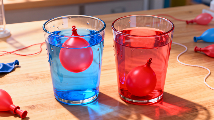 把水球放入冷水杯——水球浮起来了!