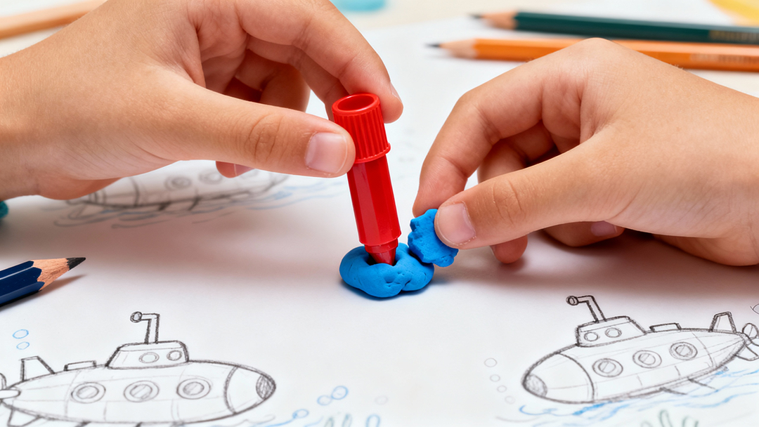取一小块橡皮泥,均匀地粘在塑料笔帽的底部。这将作为“潜水员”的配重。你可以试着将笔帽放入水杯中进行微调,确保笔帽能竖直地漂浮在水面,但大部分帽身在水下。