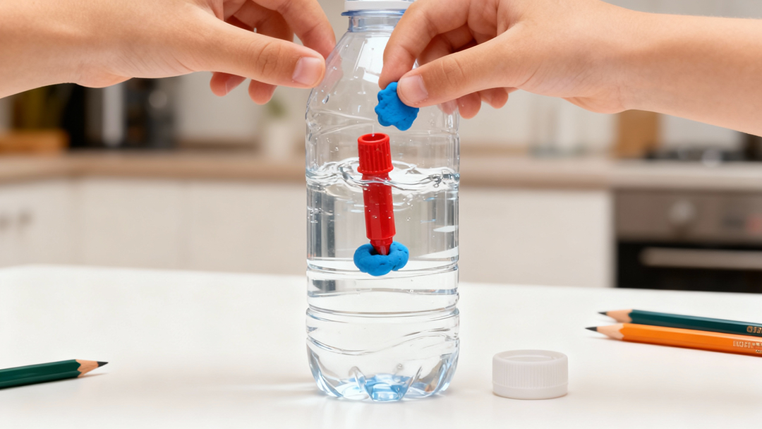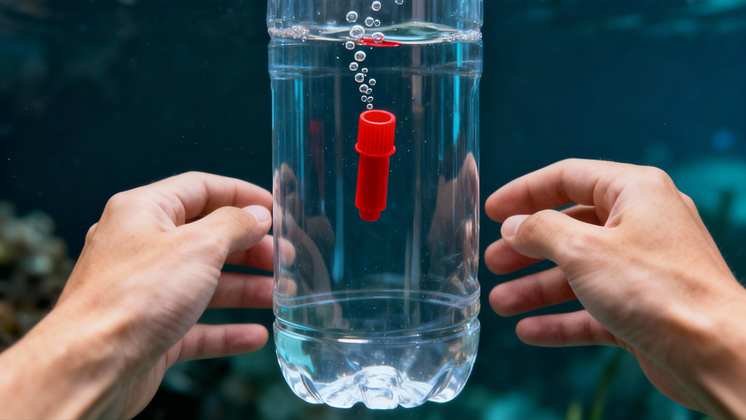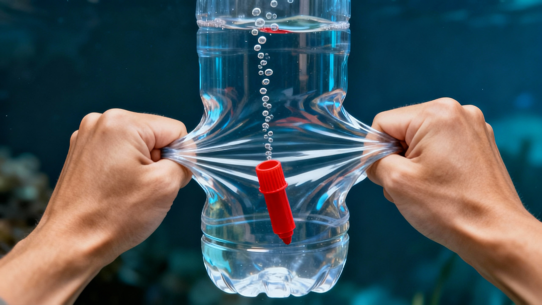 2. 下潜的秘密: 当你用力挤压瓶子时,你施加的压力通过水(液体)传递到了笔帽内的空气上。水是不可压缩的,但空气可以被压缩。于是,部分水体被压入笔帽内部,占据了原本属于空气的空间。这使得笔帽的平均密度增加,整体变“重”(更准确地说是重力大于浮力),因此下沉。