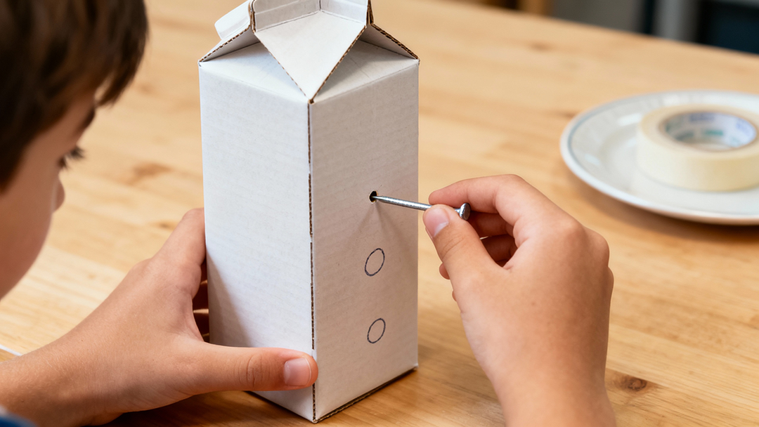 将空的牛奶盒平放在桌面上。请家长或老师帮忙,用钉子在纸盒的任意一个侧面,从上到下依次戳三个小孔。三个孔的位置需要分别位于上部、中部和底部。