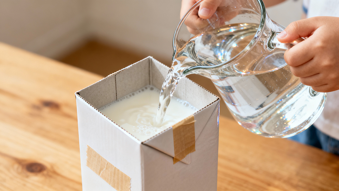 将水缓缓倒入纸盒中,直到将纸盒完全加满。