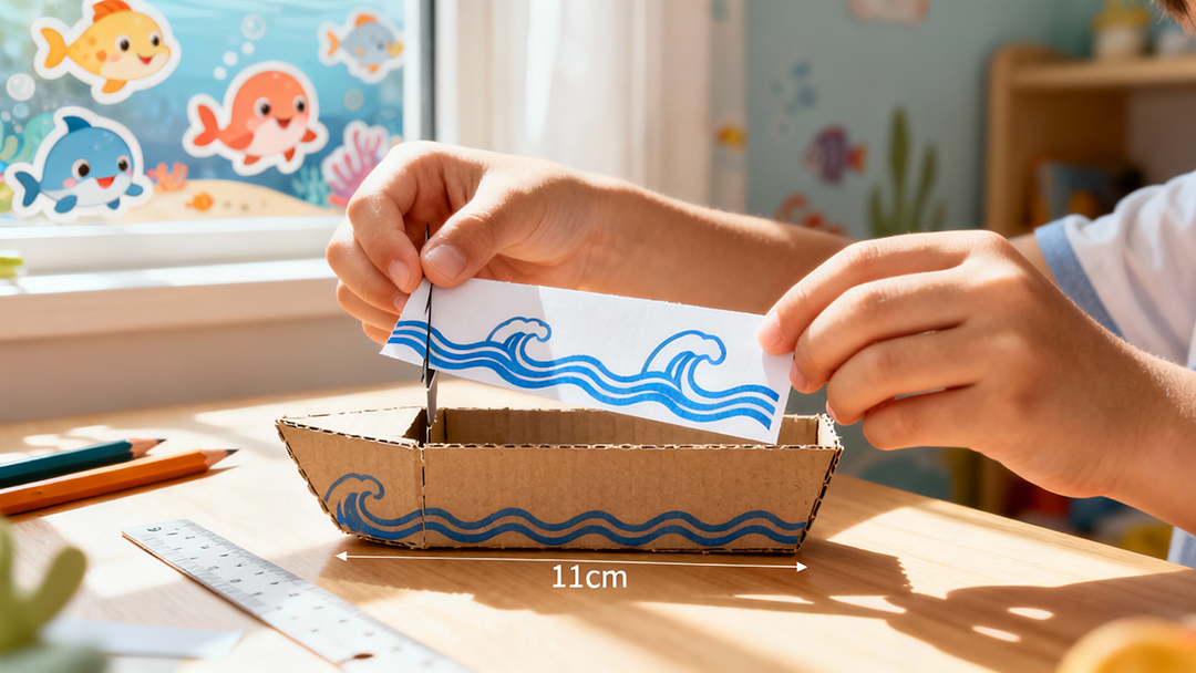 剪下长约12厘米、宽约8厘米的硬纸板作为船体。