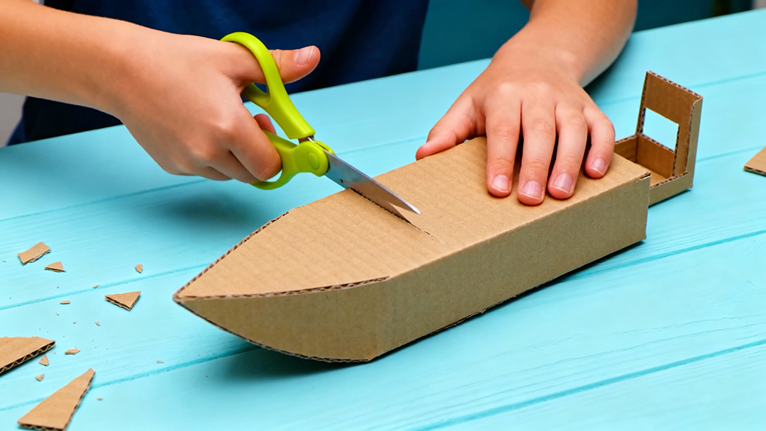 将纸板一端剪成尖形作为船头,另一端中央剪下约5厘米的缺口作为船尾。