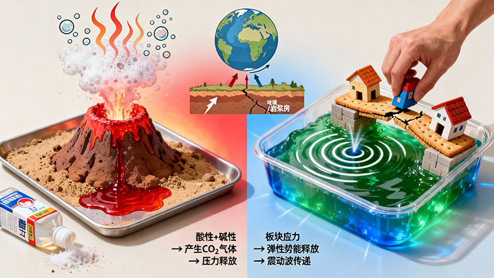 两者都是模拟地球内部活动的科学实验,但原理截然不同。火山喷发实验(小苏打加醋)模拟的是地球内部化学能(岩浆中的气体膨胀)的剧烈释放。而地震实验(如抖动果冻上的积木塔)模拟的是地壳板块运动积累的弹性势能突然释放产生的震动波。