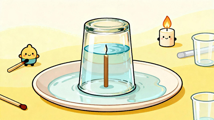 蜡烛燃烧消耗了杯子里的氧气,生成二氧化碳和水蒸气。气体减少导致杯内气压降低。当蜡烛熄灭后,温度下降,剩余气体收缩,杯内气压进一步降低。此时,杯外的大气压力高于杯内,就将水压入了杯中。