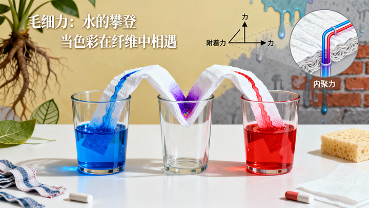 纸巾由许多植物纤维构成,纤维之间有无数细小的空隙,这些空隙就像一根根极细的管子(毛细管)。水分子与纸巾纤维之间存在着附着力(水喜欢粘在纤维上),同时水分子之间也有内聚力(水分子互相吸引)。在这两种力的共同作用下,水就能沿着这些微小的管道自动向上或向四周攀升,带动色素前进。